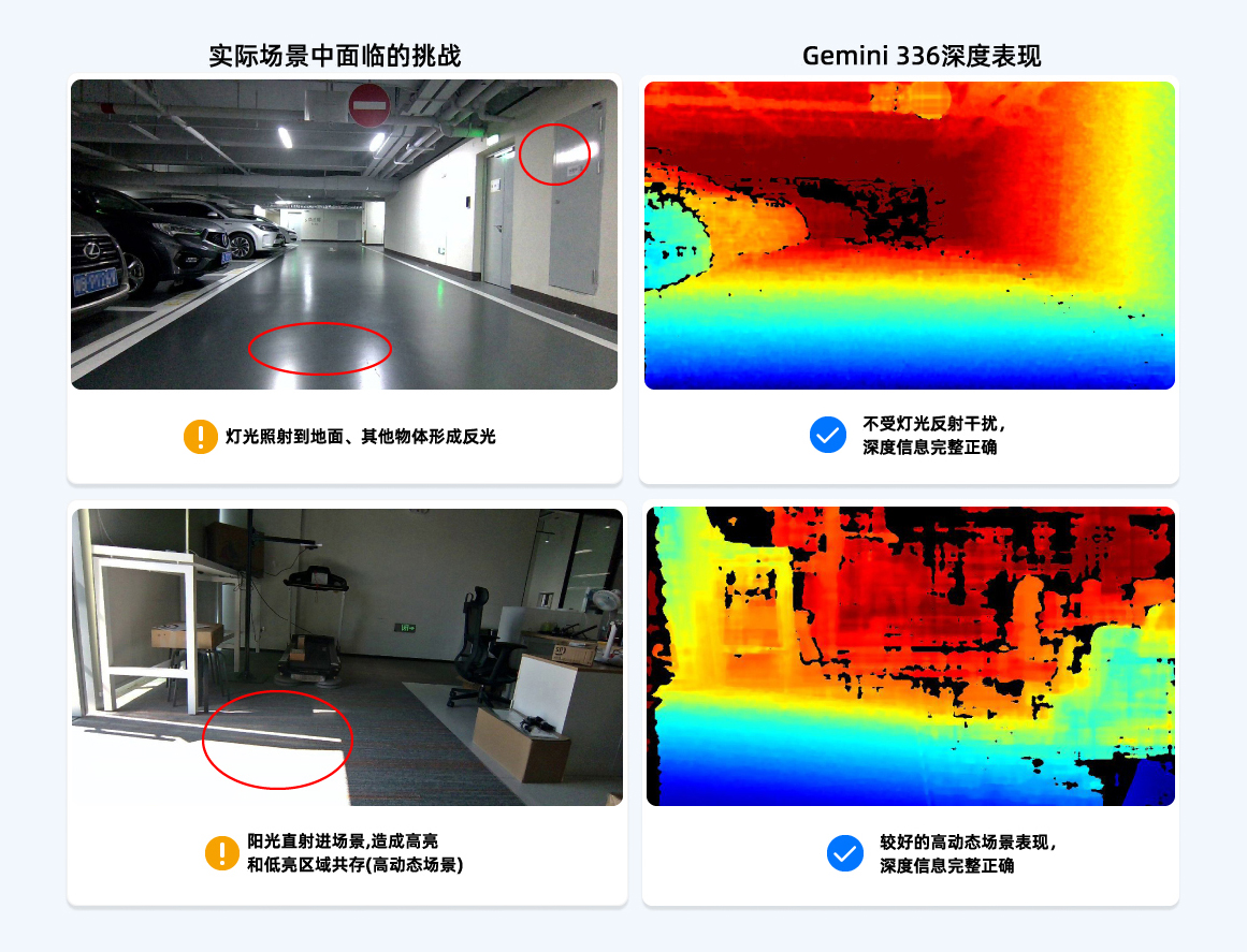 Gemini 336/336L相機(jī)解決了眩光、反光地面及高動(dòng)態(tài)場(chǎng)景中暗部區(qū)域的深度成像質(zhì)量問(wèn)題