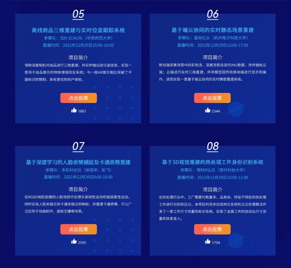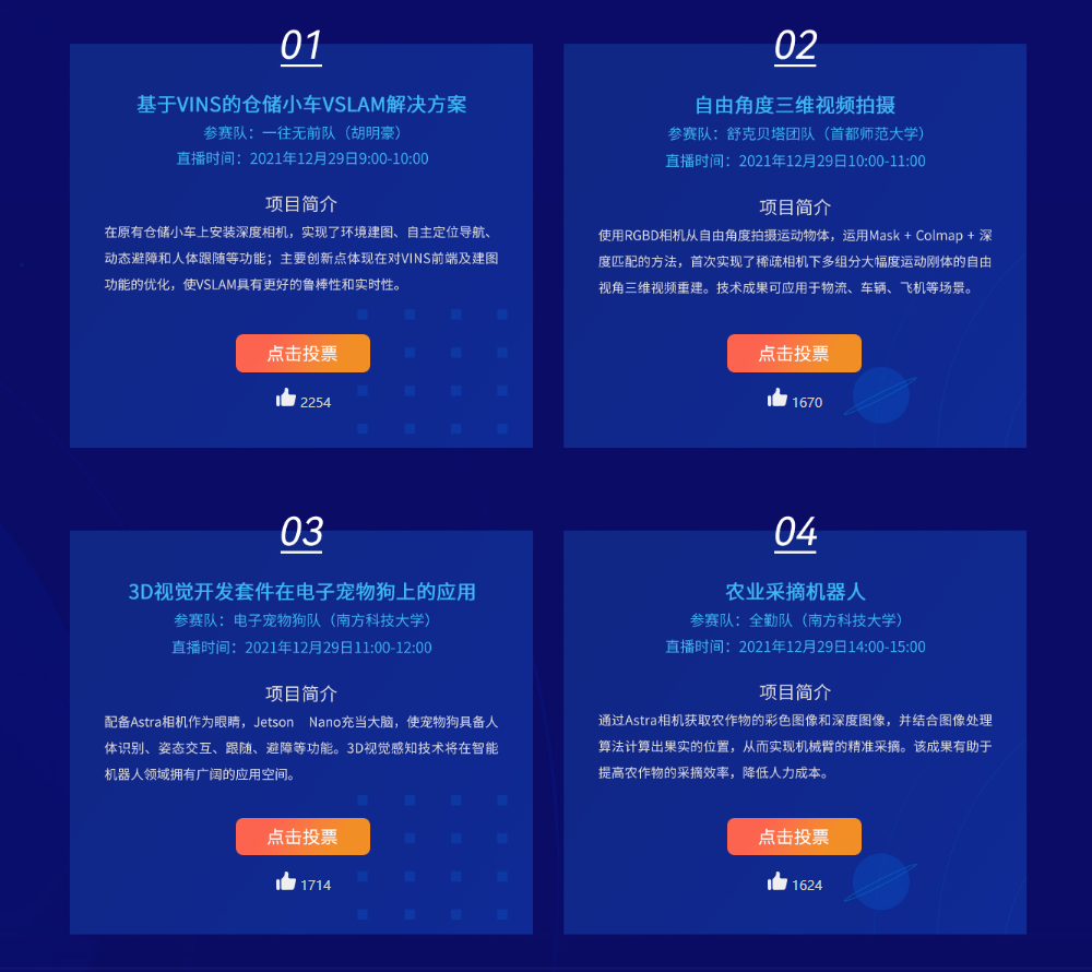 參賽項(xiàng)目均基于奧比中光3D相機(jī)與Jetson Nano的組合套件開(kāi)發(fā),展現(xiàn)出創(chuàng)新意義與應(yīng)用價(jià)值兼具的方案。在決賽環(huán)節(jié),8支隊(duì)伍展示了基于VINS的倉(cāng)儲(chǔ)小車VSLAM解決方案、自由角度三維視頻拍攝、3D視覺(jué)開(kāi)發(fā)套件在電子寵物狗上的應(yīng)用等項(xiàng)目。