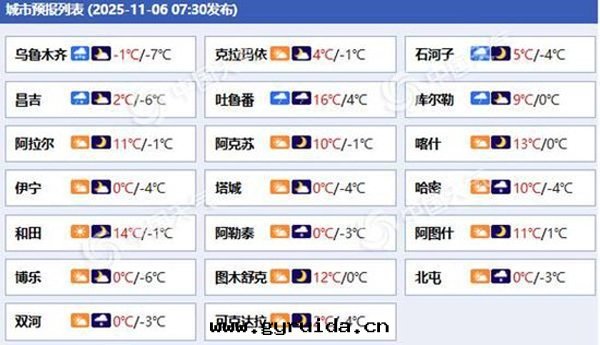11 月(yuè) 8 日(rì),阿勒泰地(dì)區(qū)的(de)部(bù)分(fēn)區(qū)域有(yǒu)小雪(xuě),山(shān)區(qū)局地(dì)中雪(xuě),全(quán)疆其(qí)他(tā)地(dì)區(qū)則以(yǐ)晴或(huò)多(duō)雲(yún)天(tiān)气(qì)为(wèi)主(zhǔ),風(fēng)力不(bù)大(dà)。